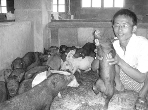 7月1日,共产党员、第三届湖南十大杰出青年农民———保靖县毛沟镇拱桥村李昌茂在查看新品太湖瘦肉型猪仔。在普通生猪价格低迷的形势下,李昌茂引进目前世界上年产仔最多的太湖母猪与美国杜落克公猪杂交,生产出一种口味独特、类似野猪的瘦肉型新品种,并采取喂传统饲料,实行野外放养,深受消费者青睐。3月4日,李昌茂与湖南烟村生态农牧科技股份有限公司签下了首笔年供应10000头新品瘦肉型猪的订单,目前已供应400多头,实现销售收入40余万元,并带动了周边26户村民从事新品太湖瘦肉型猪养殖。 张文华 王金凤 彭图荣 摄 |