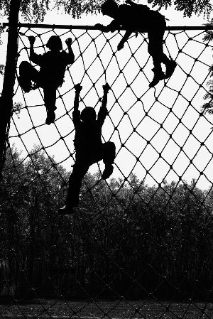 7月5日,战士们在翻越网墙。 当日,参加“友谊-2010”中巴反恐联合训练的两支特战分队混编连,在兰州军区特战大队猎人训练场继续混编同训。 新华社记者 王建民 摄