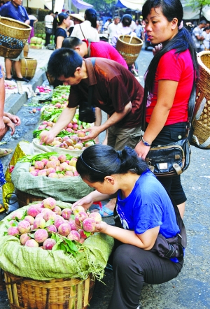 在雨灾过后的水果盛产季节,吉首市在吉首城区保险街设立农民水果零售、批发专用行,极大地便利各地农民将大量水果进城上市。连日来,每天上市的桃子、西瓜、香瓜等夏季水果达10万公斤以上,满足市民的需求。图为7月4日市民们在吉首城区农民水果街里选购新鲜的水果。