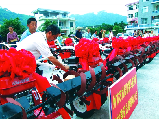 7月8日,州农机局和吉首市农机局来到吉首市河溪镇马鞍村,免费给村里赠送了21台价值79800元的新型微耕机,帮助该村大力推进柑橘、蔬菜机械化生产,以实际行动支持该村新农村建设。图为免费赠送微耕机交接现场。 田湘 摄 市农机局免费给 马鞍村送农机21台