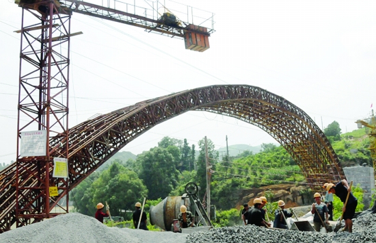 受连续降雨天气影响,今年以来,古丈县交通基础设施建设施工进度相对滞后,为抢抓进度,顺利完成年初制定的工作目标,该县充分利用当前的良好天气,狠抓工作进度。图为7月15日,古保公路古丈段河西大桥施工现场,工人们正顶着烈日紧张施工。 本报特约记者 龚令民 通讯员 向 薇 摄