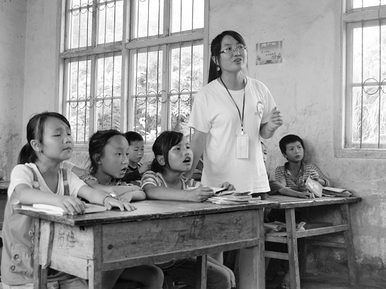 “情系湘西教育,共建和谐家园。”日前,长沙理工大学39名青年志愿者来到花垣县补抽乡,分成几个小组在该乡各个村小开展为期20天的教育、调研活动。图为该校外语系一年级赵红梅同学在指导留守学生们唱歌。 杨 青 摄