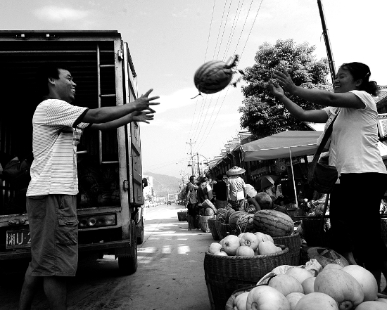 8月2日,吉首市双塘镇新田村瓜农正在转运西瓜。据悉,该村今年种植西瓜、香瓜3200多亩,由于前期雨水多,西瓜、香瓜坐果率受到严重影响,广大果农积极抗灾自救,加大培管力度,使瓜的损失降到最低。 陈绪新 摄