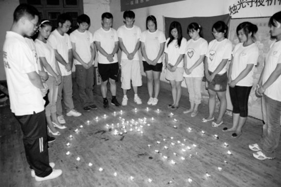 8月15日,全国各地深切悼念舟曲遇难同胞。保靖县20余名大学生西部志愿者相聚在“志愿者之家”举行“烛光守夜祈福”活动,哀悼在舟曲泥石流灾害中遇难的同胞。 张承印 黄益民 摄
