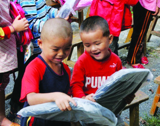 8月28日,省建设厅住房保障处一行7人深入古丈县默戎中寨小学看望、慰问40名农村贫困留守儿童,勉励他们战胜困难,立志成才,并送上5000多元学习用品,让他们感受到了社会关爱的温暖。图为留守儿童们高兴地拿着新书包。 石立新 张时红 摄
