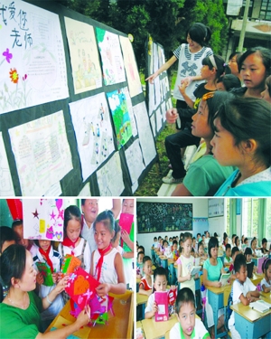 下左图:9月8日,保靖县迁陵学校6年级学生为敬爱的老师递送亲手制作的精美卡片。
