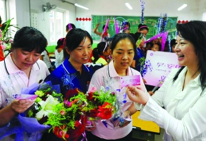 北京蓝天丰苑打工子弟学校与GE医疗工作人员为该校的部分女教师及学生家长送上健康义诊卡(9月10日摄)。活动主办方邀请她们免费接受医疗专家的体检和诊断,并希望全社会都来关注外来务工女性的健康,帮助她们增强健康意识,共同营造一个和谐安康的社会。