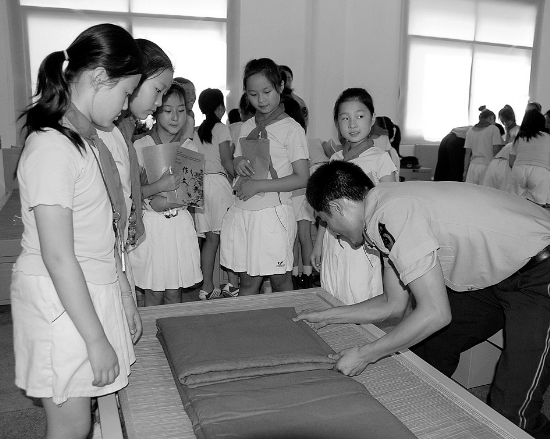 9月17日,州武警支队警营内,武警官兵正在教吉首市一小的同学们叠“豆腐块”被子。为进一步强化义务教育阶段青少年“居安思危”、爱军习武的国防意识和爱国主义精神,值“9·18”国防日来临之际,吉首市第一小学的学生们走进州武警支队警营,与武警官兵们联合开展“国防教育进警营”活动。活动中,武警官兵为学生们表演了队列、擒敌、武术等富有部队特色的节目。