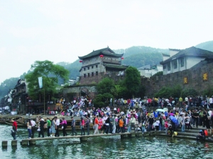本报讯(特约记者 黄晓军 通讯员 文 晖) “这边风景特别好,让人非常惬意,感觉就像一幅画,凤凰真是太美了。”10月4日,凤凰古城北门码头人头攒动,刚刚与古城合影留念的河南游客,高兴地捧起清澈的沱江水,饱经风霜的脸庞写满了笑容。10月1日至4日,凤凰县共接待国内外游客12.18万人次,实现旅游收入8445.9万元,门票收入639.28万元,较去年同期相比,分别增长68.23%、63.8%、106.09% “十一”黄金周期间,行走在凤凰县各景区景点,到处游客如潮。在凤凰古城南边街、南门砣新开张的民族商品街,各式银器、民族饰品摆满的背篓摊点排成一条 “长龙”,操作不同口音的游客正忙着挑选各式各样的旅游特色产品。为规范旅游管理从沱江河边而刚搬迁到这里做生意的苗家阿婆高兴地告诉记者,一天下来少说也有二三百元收入。在凤凰古城东正街手绘T恤店里,三五成群的青年游客围着绘有卡通、凤凰古城等图案的各式手绘T恤爱不释手,或坐着或站着,尽情地挑选自己喜欢的手绘作品。在混合着甜味与辣味的姜糖店里,工作人员正娴熟地加工制作姜糖,他们拉起姜糖的优美动作不时迎来游客的赞叹声。一身着苗族盛装的老板娘告诉记者:“我们现在提前一个小时开门,尽管增加了几个人手还是特别忙。 ” 在自驾游的带动下,凤凰县各大停车场全部爆满。行走在凤凰各乡村旅游景点,随处可见长长的车队。在苗族文化浓郁的落潮井乡勾良苗寨,能容一千多人的表演场座无虚席,原定每天两场的民族歌舞表演,不得不应游客需要而进行加演。而在山江镇苗人谷景区,来自全国各地的游客在试穿苗族服装比赛中,有的游客穿错了裤脚,有的戴反了帽子,让人捧腹大笑。来自浙江省杭州的游客李先生,抹着脸上的锅底灰,接过苗家阿妹的米酒一饮而尽。他高兴地说:“可以参与表演,还可以尝上真正的苗家菜,这次凤凰之行真不错,下次还会再过来!” |