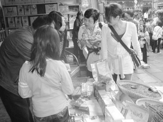 国庆节期间,永顺芙蓉镇游客如潮。图为10月5日,张春艳女士经营的“刘晓庆茶楼”的“土司擂茶”、“古丈毛尖”吸引众多外地游客。 罗远程 摄