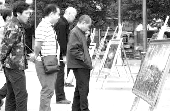 10月5日以来, 国际职业摄影师李帮发《边城》主题摄影作品展在花垣县边城广场展出,其展出的98幅作品全部取材于边城镇翠翠风景区,作品古香古色地展示出了边城景区特有的民情民俗。图为10月9日花垣群众在展出现场观看摄影作品。 石林荣 摄