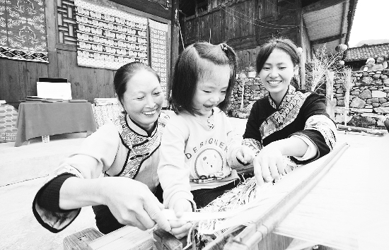 近年来龙山县文化局注重民间文化传承,目前已在全县设立了4所非物质文化遗产传习所,苗儿滩镇已建立了15个家庭式土家织锦作坊,一方面传承土家织锦技艺,一方面为土家妇女带来了收入。图为土家织女向小朋友传授织锦技艺。 本报记者 张 谨 摄