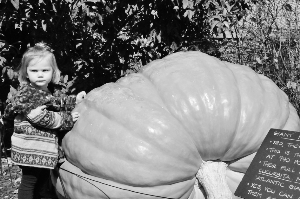芝加哥展出巨无霸南瓜。10月16日,在美国芝加哥植物园内,一名儿童站在巨型南瓜旁。标牌文字显示,这颗南瓜重达940磅(约426公斤)。 新华社发(蒋新彤 摄)
