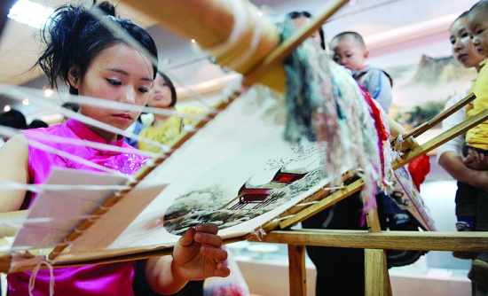 10月19日,在湖南省工艺美术职业学院的展厅里,来自该校湘绣专业大三的学生卜琳珊正在为参观者表演湘绣双面绣。 当日,首届中国湘绣文化艺术节暨第三届湖南省工艺美术品博览会在长沙开幕。本次艺术节包括中国刺绣高峰论坛、湘绣工艺展演、绣女技能大赛等活动,吸引了湖南省湘绣行业相关的企业和科研教育机构前来参展。 新华社记者 李 尕 摄