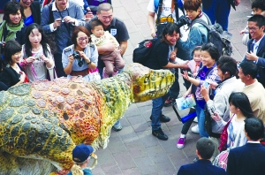 ▲10月22日,一位澳大利亚馆的工作人员装扮成“活恐龙”在世博园内巡游,吸引了众多游客与其亲密接触。 新华社记者 裴 鑫 摄