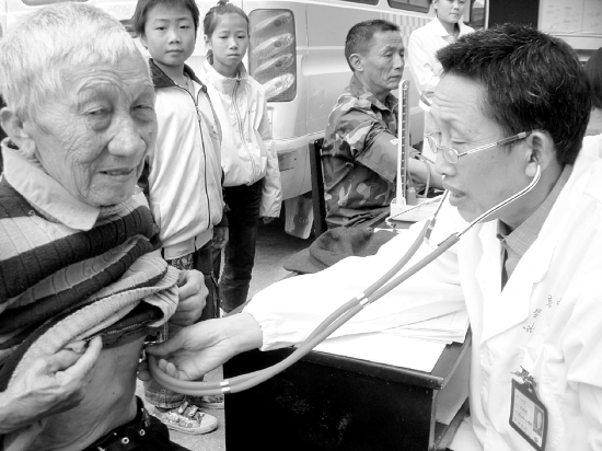 永顺县中医院为全县30个乡镇1500多名孤寡老人和孤儿义诊。图为10月21日,医护人员为该县最边远的盐井乡孤寡老人和孤儿义诊,并且为他们建立了《居民健康档案》。 唐启武 周沛涛 摄