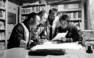 11月23日, 龙山县土家族“农民作家”刘大印(左一)在家中的“农家书屋”,与土家族文学爱好者探讨文学创作。今年,刘大印继续“一手拿笔、一手拿锄”,创作、编辑了20余万字的文学作品,农业综合收入也达到了8万元,实现了创作、创收的“双丰收”,受到湘西州文联和作家协会的表扬。 易长松 摄