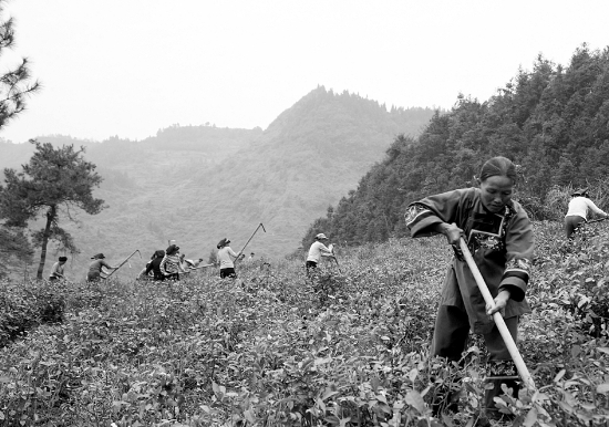 古丈县神土地农副特产制品厂为响应该县县委县政府“扩建万亩茶园”的号召,积极组织工人在扩建茶叶基地的同时,利用三年幼苗期套种蒿草,合理利用土地,促进了企业产品多元化发展和土地的经济价值。图为11月23日,神土地农副特产制品厂的员工正在扩建茶叶基地。 张时红 摄
