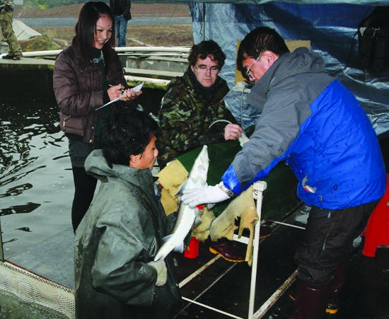 11月25日,花垣县北欧玛鲟鱼养殖有限公司西北利亚鲟鱼养殖基地,来自法国的技术总监菲利普(中)正在检验鲟鱼的雌雄,以便分开放养。西北利亚鲟鱼养殖及鱼子酱出口加工项目,是该县于2008年从中法合资企业———北京北欧玛生物科技有限公司引进的农业产业化项目,总投资6000万元。目前,养殖基地建成投产,放养鲟鱼近2万尾,鱼子酱加工厂正在建设中。项目全部建成后,