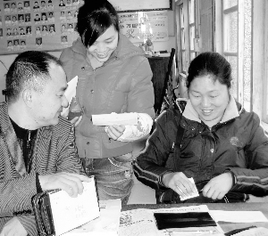 11月29日,龙山县里耶镇里耶社区干部刘和平(右),在给里耶民族中学教职工家属办理新型农村合作医疗。近来,该社区干部积极宣传新型农村合作医疗政策,并采取上门服务等形式,人民群众踊跃参加。截至当天,参加新农合人数已达1108人。 田茂宏 摄
