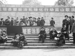 为让整脏治乱绿化行动深入人心,真正达到“全民知晓,全民支持,全民参与,全民监督”,花垣县通过电视、报纸、网站、横幅、苗歌等多种形式,充分营造全民积极参与整治工作的良好社会氛围。图为日前,该县在边城广场举行整脏治乱绿化行动苗语山歌演唱。 潘尚德 摄