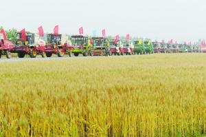 联合收割机在河南省驻马店市农村准备收割小麦(6月1日摄)。