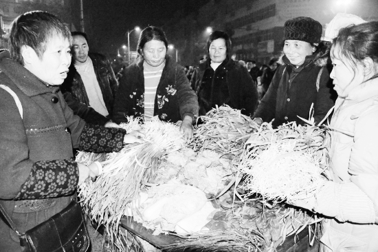 近年来,龙山组织县农办、农业局、蔬菜办和扶贫办等单位大力发展无公害蔬菜生产基地。目前,该县生产辣椒、白菜、西红柿等20余个品种的无公害蔬菜,产品畅销湘鄂渝边区10多个县市,确保了湘鄂渝边区“菜篮子”市场的稳定。图为 12月5日凌晨,龙山县周边县市做蔬菜生意的大妈们连夜坐车来龙山县城蔬菜交易市场采购蔬菜。 田志波 摄