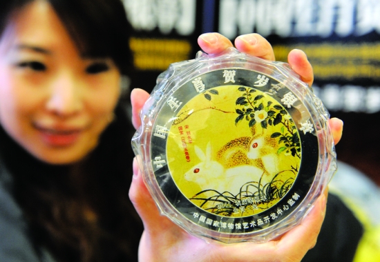 国博推出中国生肖贺岁金银章 12月9日,北京菜百的工作人员在展示贺岁金银章。 当日,中国国家博物馆艺术品开发中心在京推出兔年版中国生肖贺岁金、银章。该款产品选用国宝名画宋代刘永年的《花阴玉兔卷》入图,采用彩金、彩印工艺打造。 新华社发