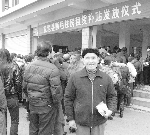 12月14日,花垣县在该县城南保障性住房安置小区内举行2010年廉租房租赁补贴发放仪式。当天,该县房产部门按每户1500元的标准为685户城镇低收入住房困难家庭发放廉租住房租赁补贴102.75万元。图为一位老大爷在领取廉租住房租赁补贴后脸上乐开了花。
