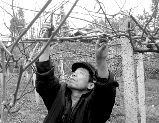 12月19日,永顺县松柏镇花桥村村民罗天贵正在为猕猴桃剪枝。今年他家栽种猕猴桃3亩,收入近万元。近年来,该县以产业发展助推新农村建设,为发展猕猴桃种植,提供资金、技术扶持,精心打造“金果”产品,形成产销两旺态势,极大地提高了果农的积极性。 罗寿冈 摄