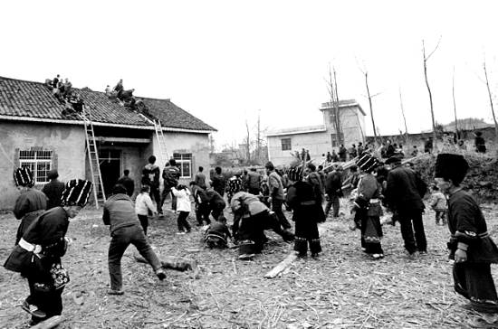 凤凰县柳薄乡德榜村特贫无房户石玉林为感谢党、政府支助他扶贫建房和村里群众无偿出工出劳帮助他修建新房。12月19日,新居落成时,他用苗家民俗上梁抛粑粑、唱苗歌、打苗鼓来感谢党、政府对他的极大关怀和村民的无私帮助,当天全寨村民都来参加祝贺。图为上梁抛粑粑时的热闹场景。 程明君 陈满妹 摄
