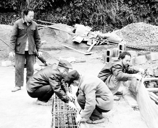 龙山县自2009年6月实施“一事一议”试点工作以来,共投入资金1500余万元,有效地促进了村级公益事业建设的发展。图为2010年12月27日,该县贾市乡新寨村正在组织施工人员对便民桥桥梁进行装模灌浆。 杨运大 杨章军 摄