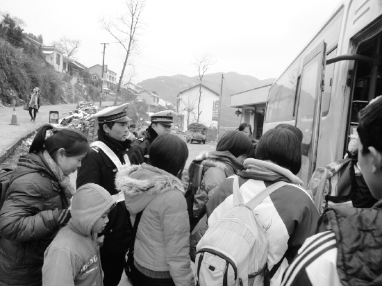▲1月1日以来,泸溪县境内出现雨雪恶劣天气,交警采取分流、疏导、护送等措施使群众安全返回。图为1月3日下午,60多名滞留在319国道洗溪能滩段的返校学生,通过民警联系大巴车免费接送,得以安全返校。 孙拥军 杨 兰 摄