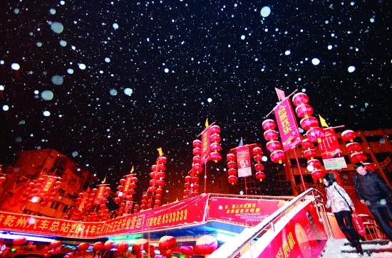 2011新年的又一场大雪降临。地面上铺着一层厚厚的积雪,树上更是一派“千树万树梨花开”的美态。瑞雪兆丰年。图为1月18日 凌晨2点吉首天桥上,漫天的大雪和节日的灯笼交相辉映。 本报记者 彭 伟 摄