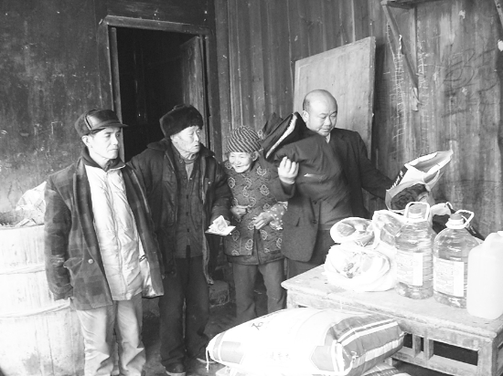 保靖县大妥乡马洛村退伍军人、农民梁绪毛致富后心系贫困群众,2009年以来,先后救助贫困群众、留守儿童、困难家庭大学生10余人次,钱物2万余元。图为1月23日,梁绪毛救助清水坪镇山溪村贫困老人彭忠伯家,为他送上猪肉、大米、食用油、衣服等价值1800元钱物,并表示将长期支助彭忠伯孙女直至大学毕业。 彭书凤 张晓莉 摄