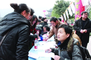为保证全县富余劳动力的有序安全就业,1月29日,凤凰县以“民生为本,人才优先”为题,在县从文广场举办了首场“2011新春大型招聘会”。本次招聘会共有180家省内外用人单位参加,提供招聘职位8000个。据了解,招聘会上,用人单位与求职者当场签约5541份,签约率达69.26%。图为求职者正在招聘会现场同用人单位代表交流、咨询。 欧介中 吴金显 摄