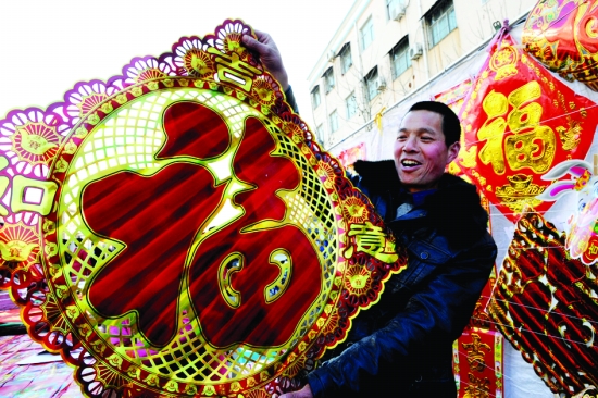 1月30日,河南省荥阳市广武镇一位农民在年货市场上选购福字门贴。 春节临近,河南各地农村新春气息越来越浓,年货市场上春联、门神、福字门贴、红灯笼等喜庆饰品琳琅满目,呈现出一派红红火火的节日景象。 新华社记者 朱 祥 摄