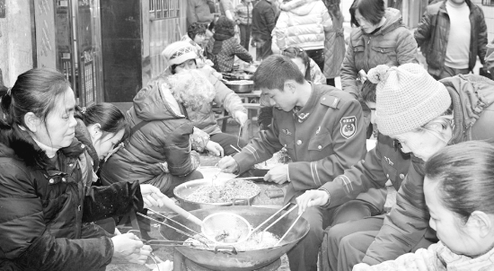 2月1日上午,在花垣县花垣镇西长街社区,该县消防官兵和社区居民一起炸油香粑粑,绘制出军民同乐,军民同过年的和谐画卷。 吴海波 石丽芬 摄