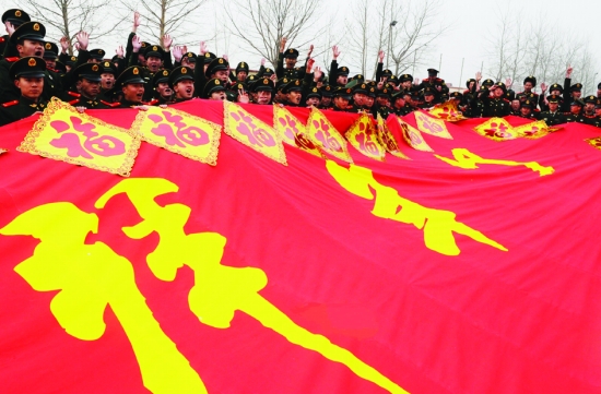 2月1日,河北公安边防总队新训团新战士在训练场上拉出条幅向远在家乡的亲人拜年。 新华社记者 杨世尧 摄