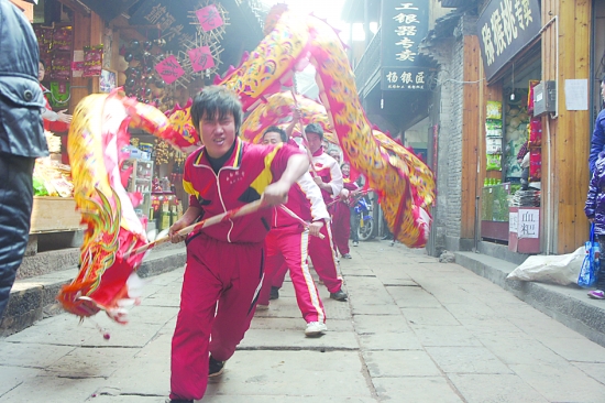 新春伊始,凤凰古城系列民俗闹春活动,成为古城一道亮丽风景。龙狮队走村串户,增加了节日气氛。 曾文松 摄