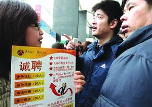 2月13日,一名招聘人员(左一)正在积极游说求职者应聘。