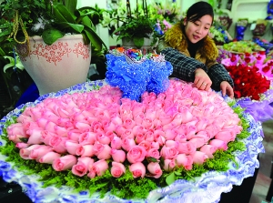 2月14日情人节将至,各地鲜花店的玫瑰热销,各色包装精美的情人节礼品也深受年轻消费者的青睐。