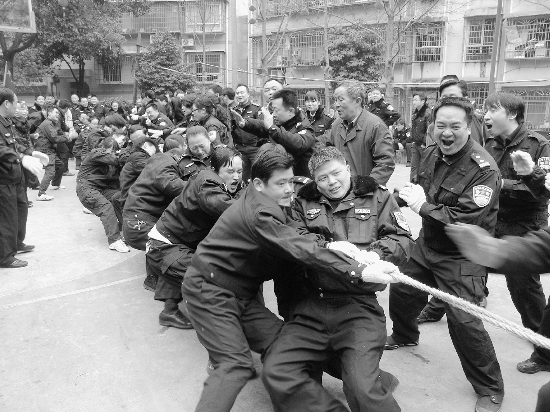 2月17日,州公安局民警在球场举行拔河比赛。为欢庆元宵佳节,丰富公安警营文化生活,营造健康、向上的文化氛围,该局组织民警开展了纤夫夺红旗、跳绳、滚轮胎、二人夹球、拔河等竞赛活动,有效地增强了民警的凝聚力和战斗力。 李进辉 摄