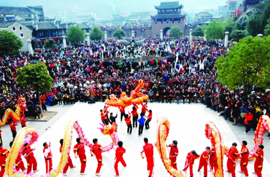 2月17日,凤凰县“鼓舞凤凰,万众联欢”元宵文艺演出在该县文化广场隆重举行。《龙腾盛世》、《百狮争春》等独具地方特色的文化节目,让来自国内外的游客和当地群众大饱眼福。 彭 伟 陈庭茂 黄晓军 摄