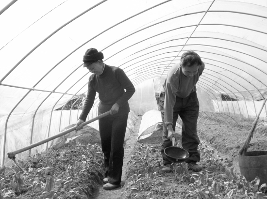 近年来,保靖县清水坪镇实施产业结构调整,极大地调动农民规模种蔬菜的积极性,使农民增收农业增效。图为日前,该镇下码村彭贵富夫妻俩正在大棚内给蔬菜松土、施肥。 俞采华 陈亚平 摄