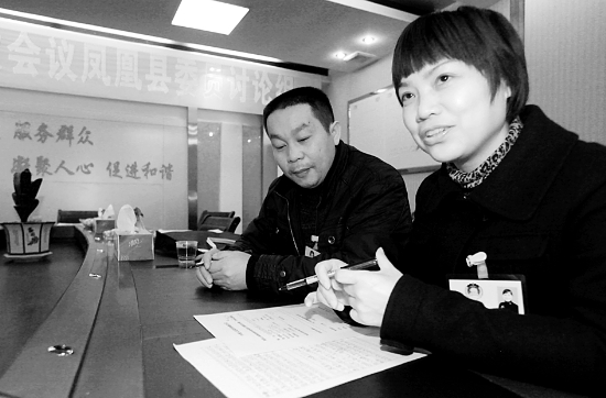 凤凰县委员组何书香委员(右一)正在撰写建立县级急救中心和康复中心的提案。