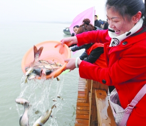 2月28日,人们在无锡灵山码头向太湖投放鱼苗。