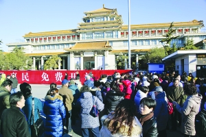 3月2日,中国美术馆正式面向社会实行免费开放,开馆前许多参观者在领票处前排起长队。