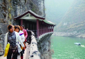 游客行走在小三峡“仿古栈道”上(3月8日摄)。