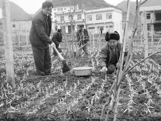 3月3日,永顺县松柏镇松柏村村民宋兵兵和民工们一道正在猕猴桃苗圃里忙于育苗。宋兵兵自1998年以来,就钻研猕猴桃培管技术,且开始育苗,年销售幼苗5万株以上,既服务了群众又使自己致了富。 罗远程 摄